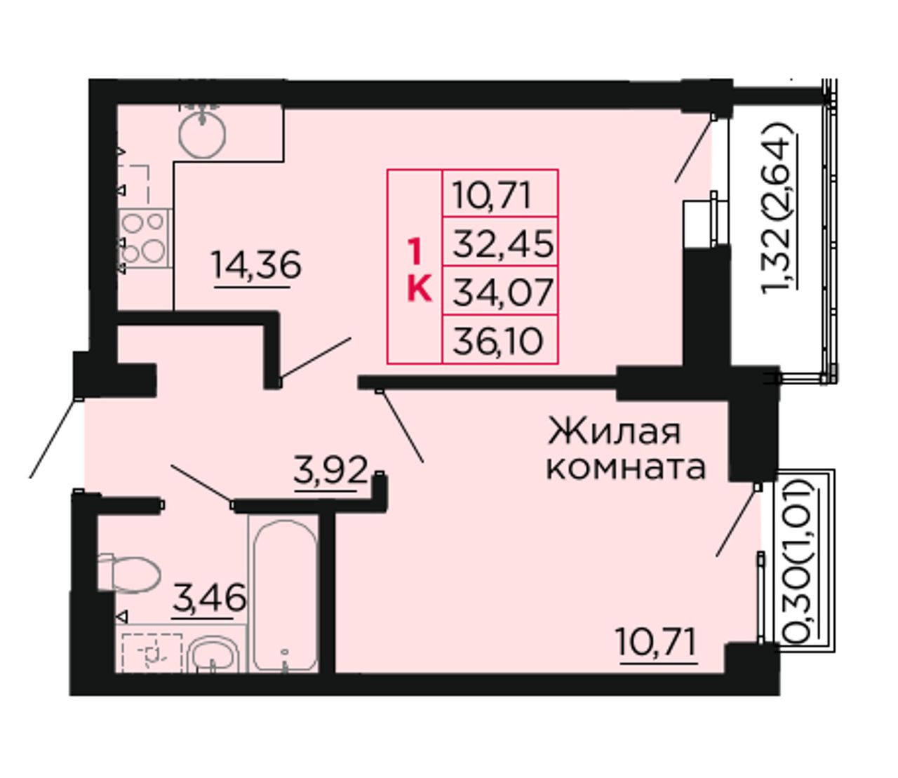 1-комнатная — 34,6 м² 6/9 эт. в Вишнёвый сад