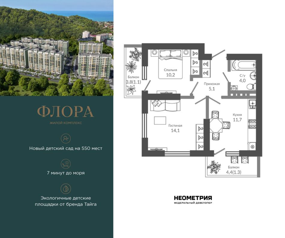 Продается квартира в ЖК «Флора» от федерального девелопера «Неометрия». Это жилой комплекс комфорт-класса в самом зеленом районе Сочи. При проектировании постарались максимально сохранить окружающую флору и фауну. Теплое море, горы, целебные источники, река, близость заповедника – все это уже рядом с вами.