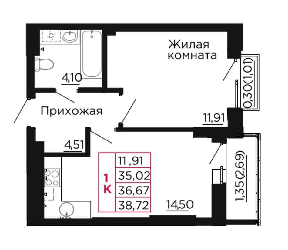 | 1-комн. | 43 м² | 5,5 - 7 млн ₽ |