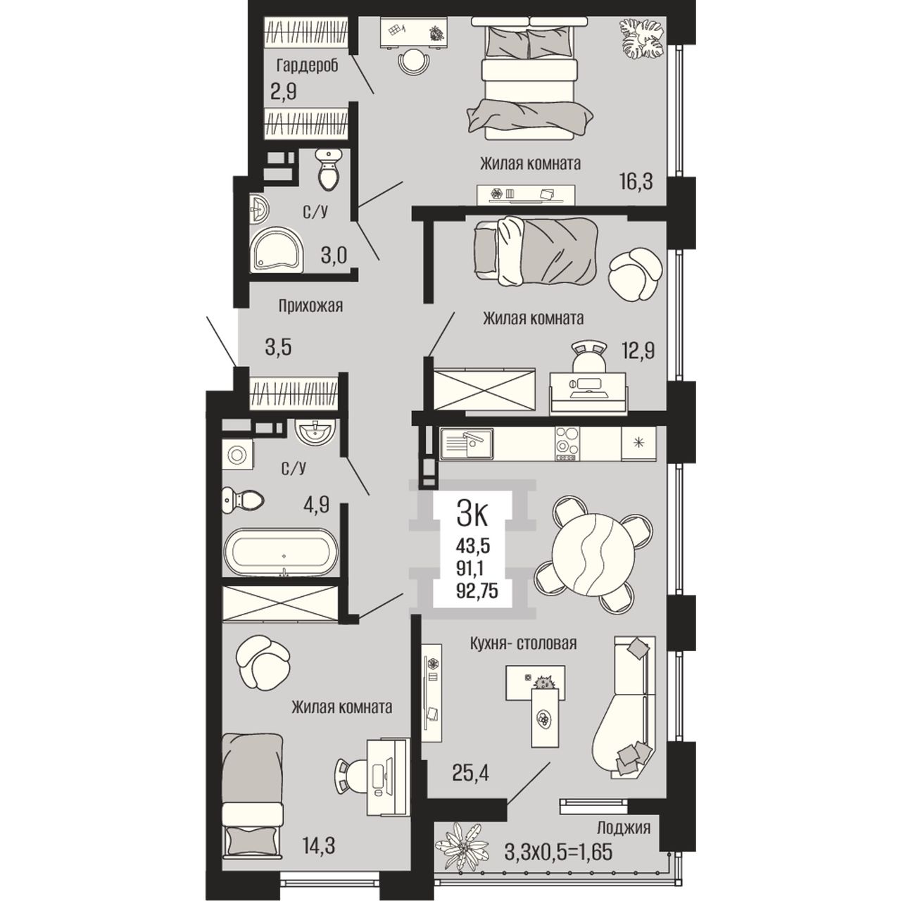 3-комнатная — 92,75 м² 6/12 эт. в Половецкий