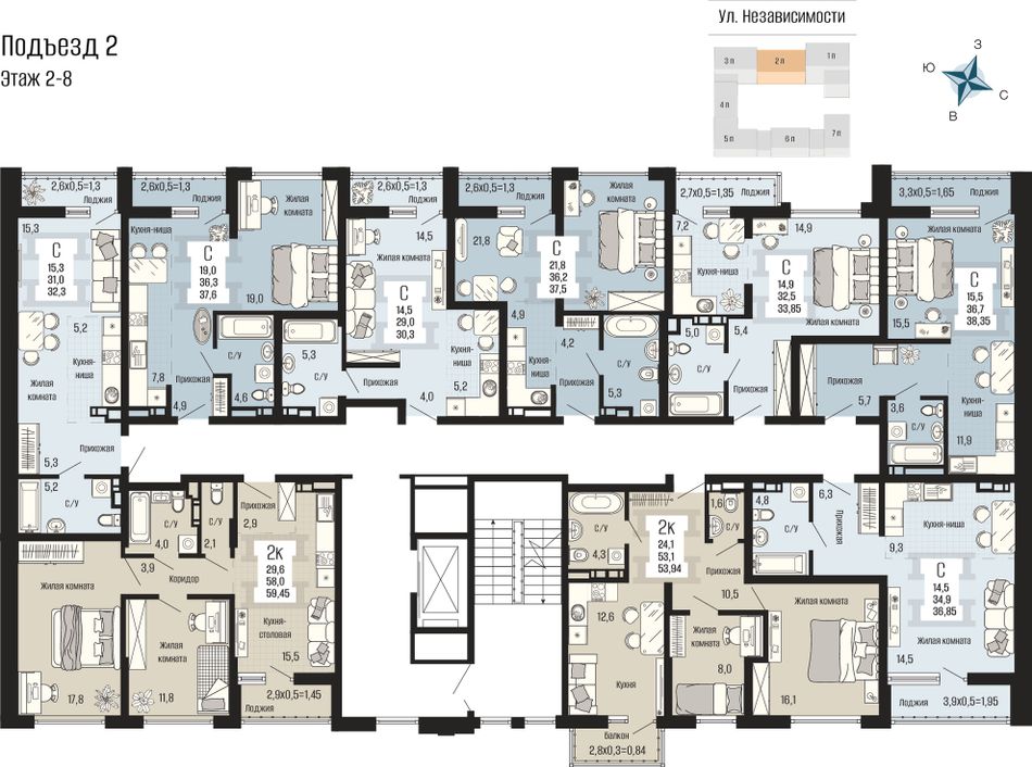 • Просторные планировки с панорамным остеклением. От студий до трехкомнатных квартир. Светлые и функциональные решения.