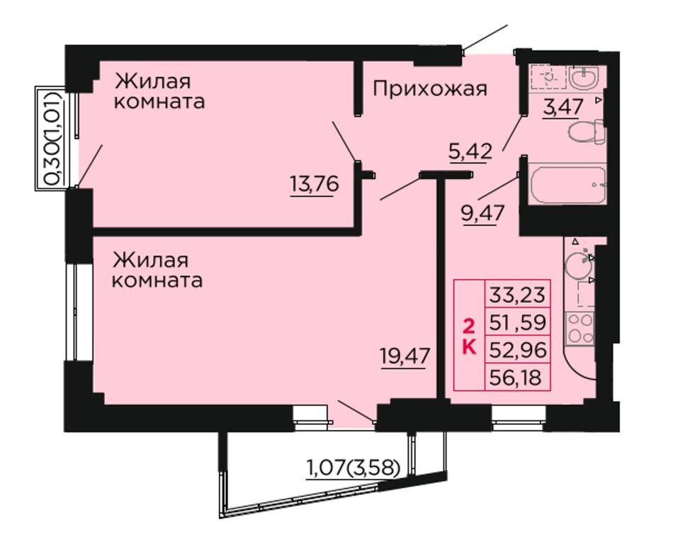 2-комнатная — 53,3 м² 8/10 эт. в Вишнёвый сад