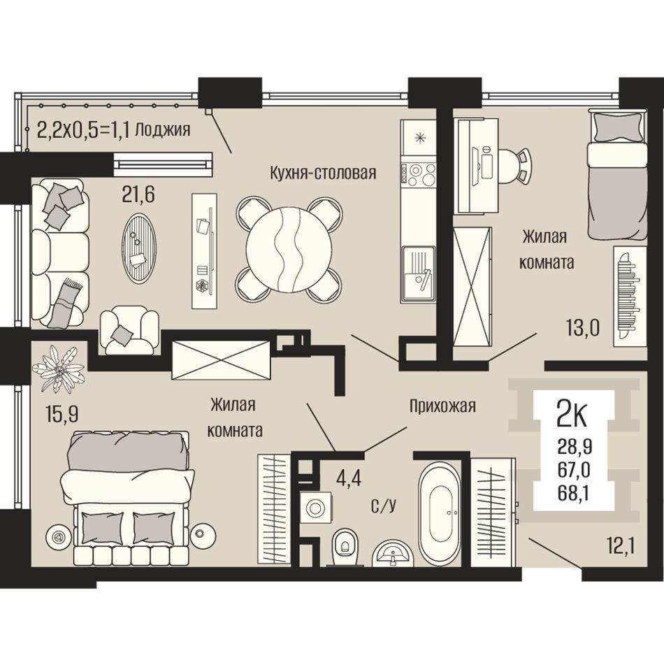 2-комнатная — 68,1 м² 12/12 эт. в Половецкий