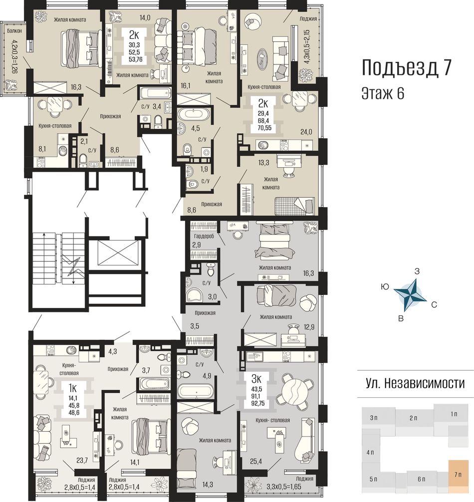 • Просторные планировки с панорамным остеклением. От студий до трехкомнатных квартир. Светлые и функциональные решения.