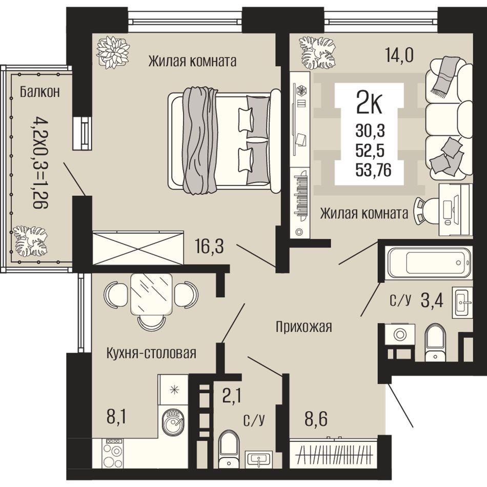Общая площадь53,76 м²