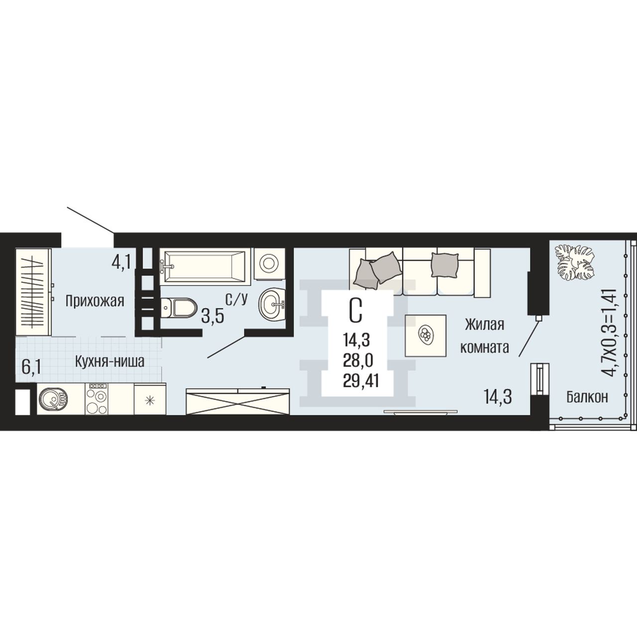Студия — 29,41 м² 6/12 эт. в Половецкий