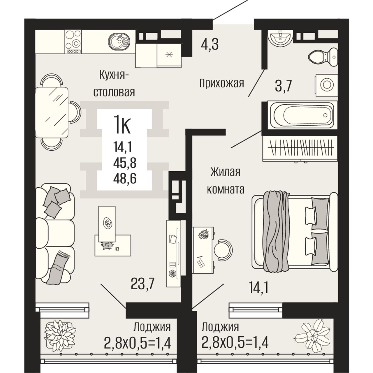 Общая площадь48,6 м²