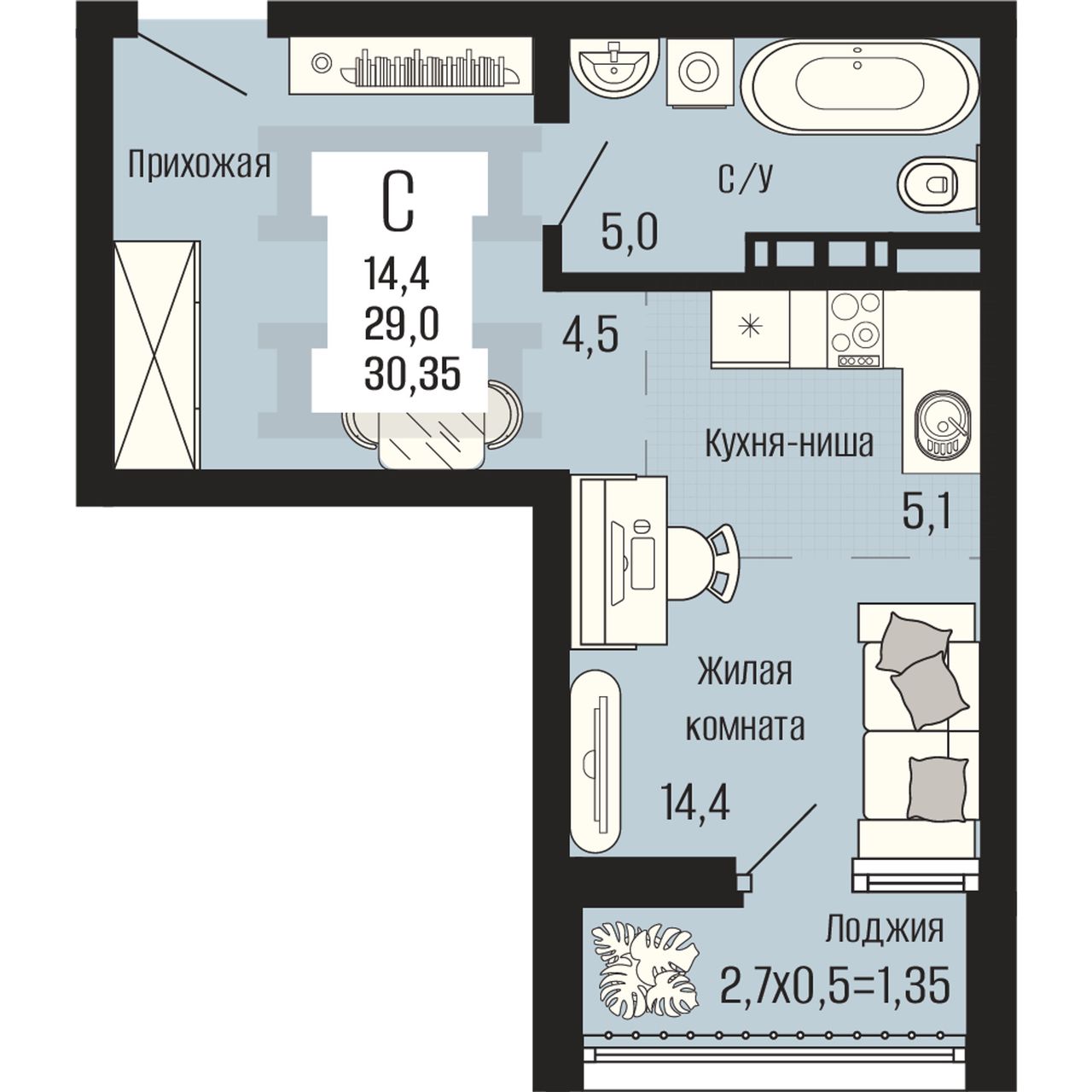 Студия — 30,35 м² 2/12 эт. в Половецкий