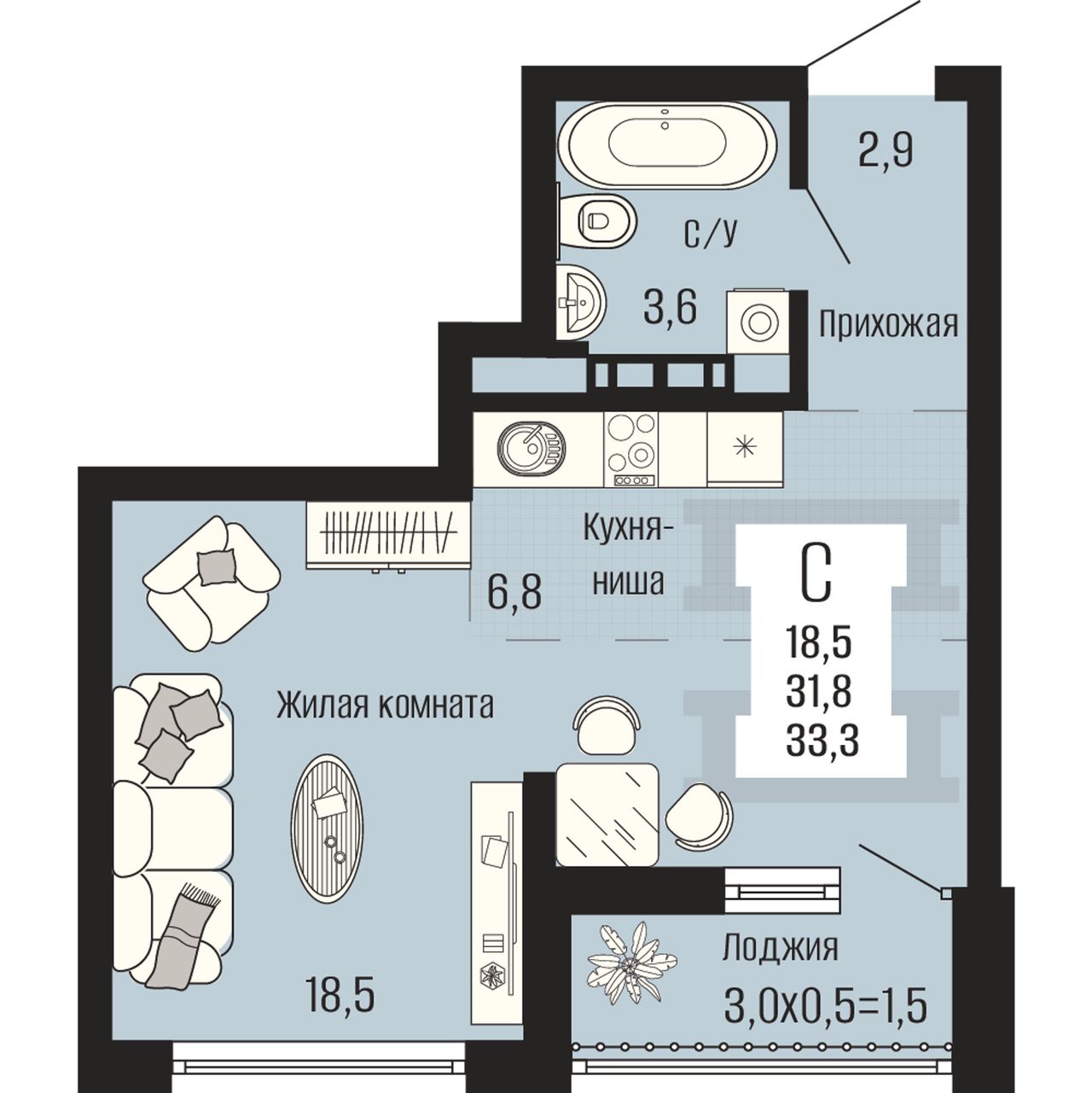Общая площадь33,3 м²
