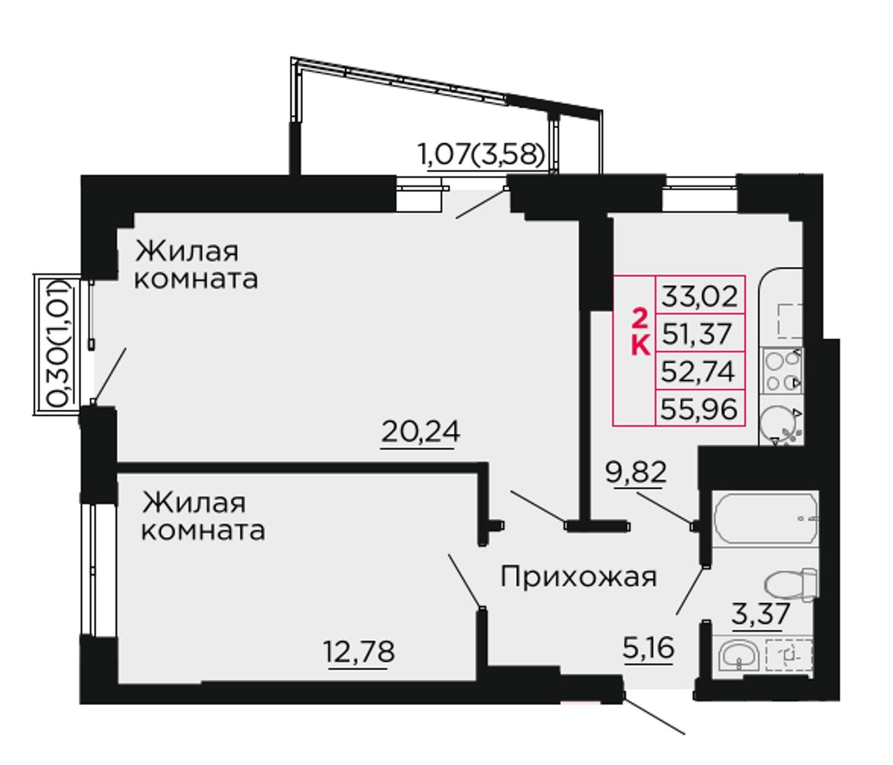 2-комнатная — 53,2 м² 7/10 эт. в Вишнёвый сад