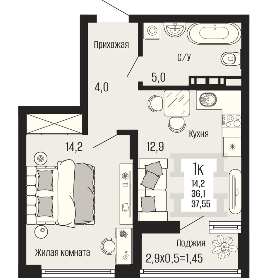 1-комнатная — 37,55 м² 2/12 эт. в Половецкий