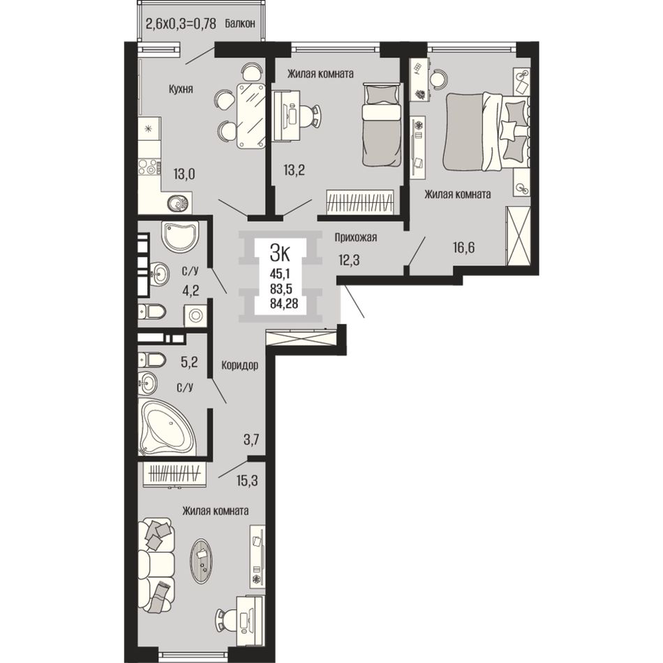 3-комнатная — 84,28 м² 2/12 эт. в Половецкий
