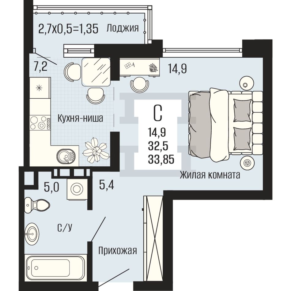 Студия — 33,85 м² 3/12 эт. в Половецкий
