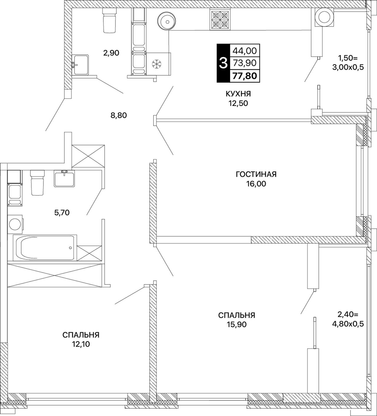 3-комнатная — 77,8 м² 10/11 эт. в Сияние