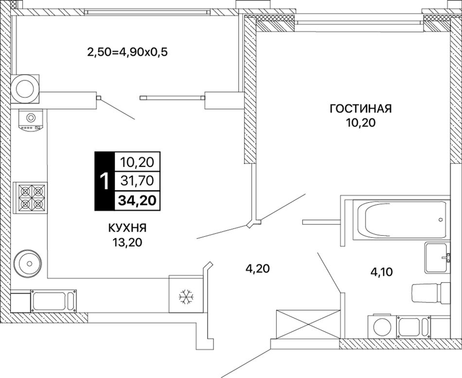 1-комнатная — 34,2 м² 7/11 эт. в Сияние