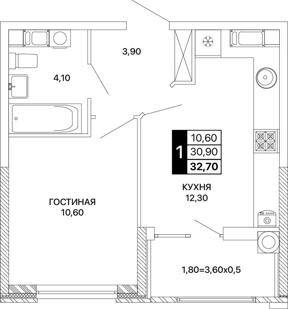 1-комнатная — 32,7 м² 6/11 эт. в Сияние
