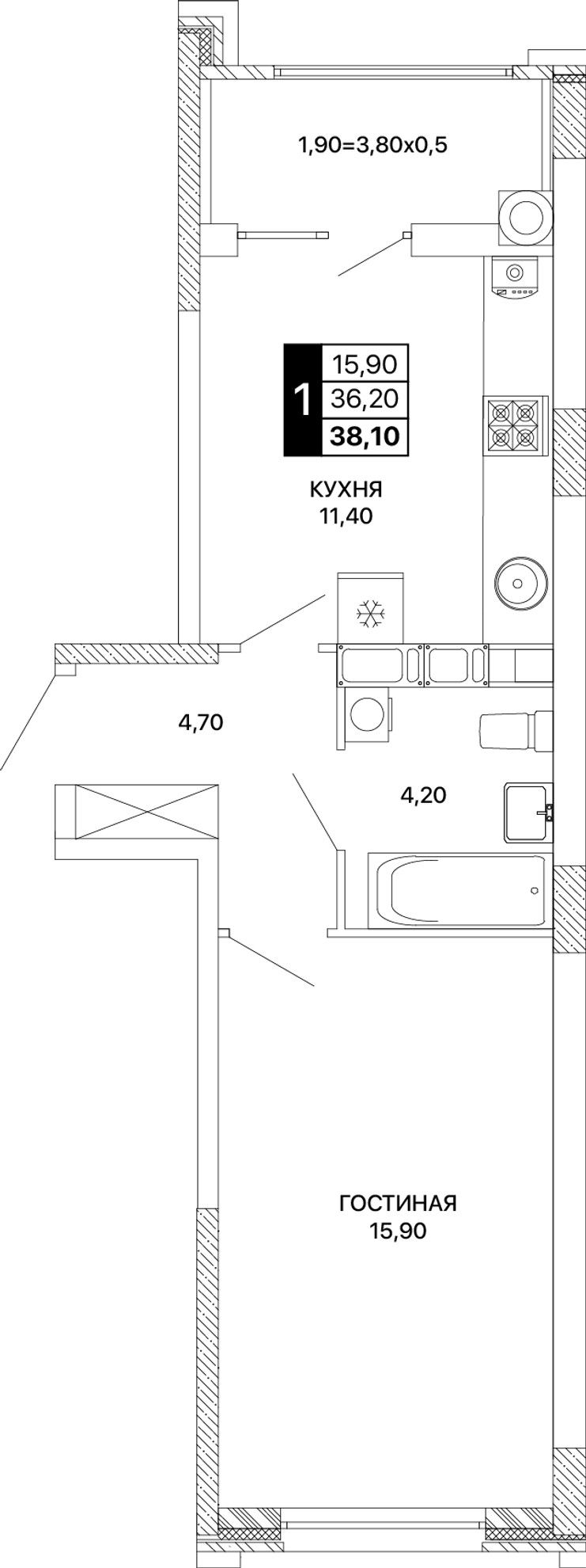 1-комнатная — 38,1 м² 6/11 эт. в Сияние