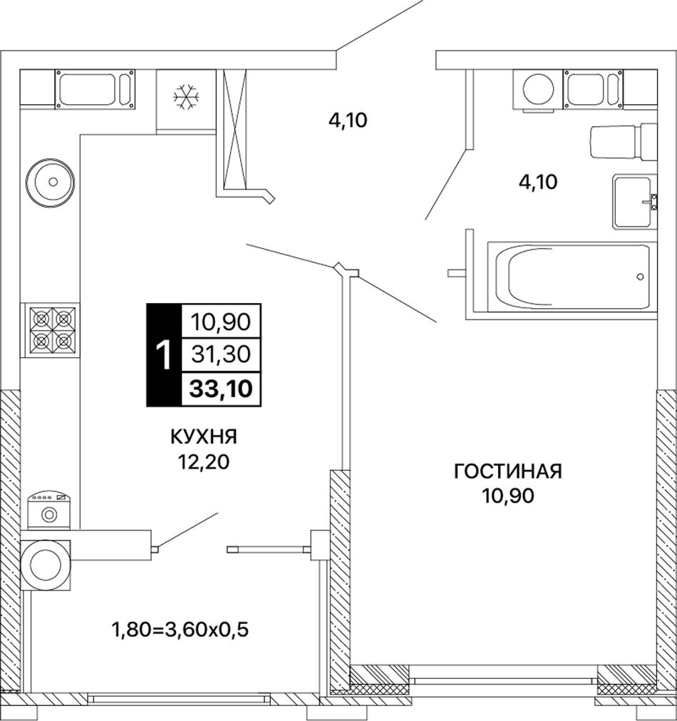 1-комнатная — 33,1 м² 5/11 эт. в Сияние