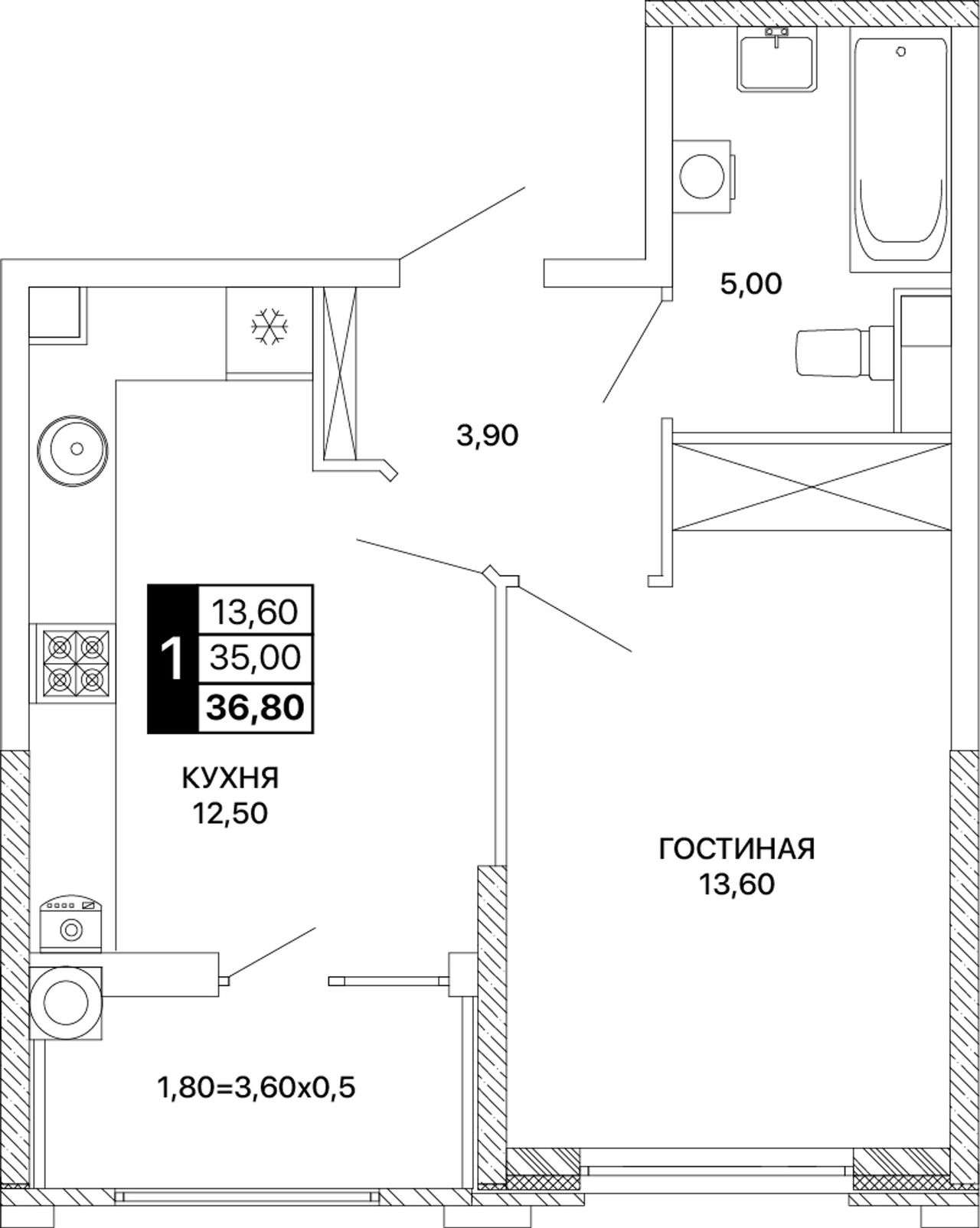 1-комнатная — 36,8 м² 2/12 эт. в Сияние