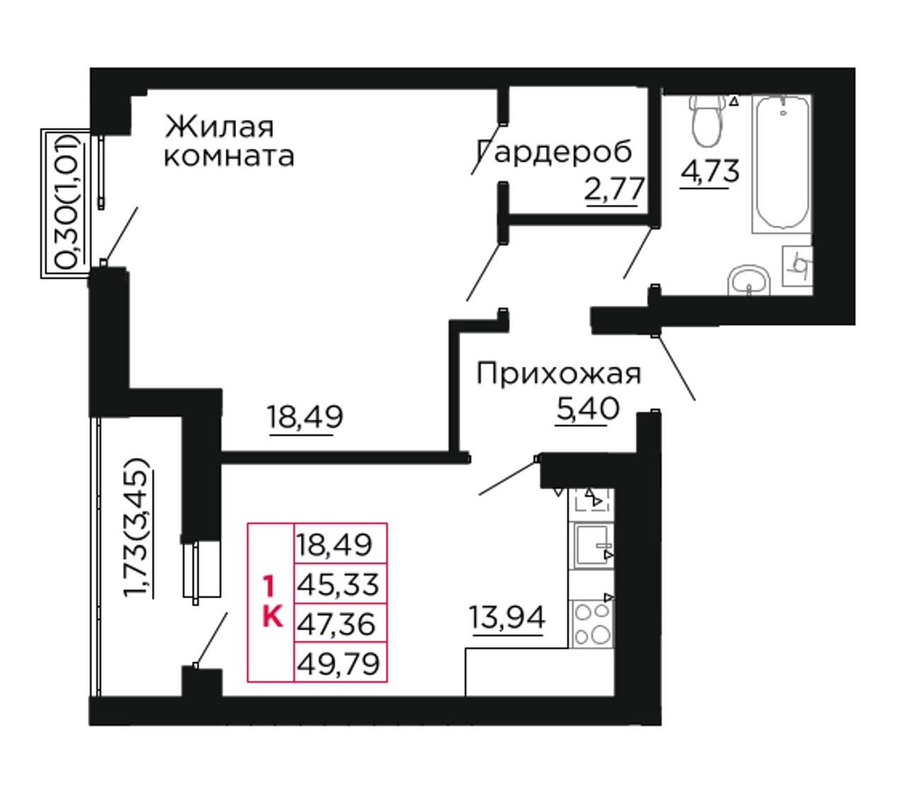 1-комнатная — 47,3 м² 7/10 эт. в Вишнёвый сад