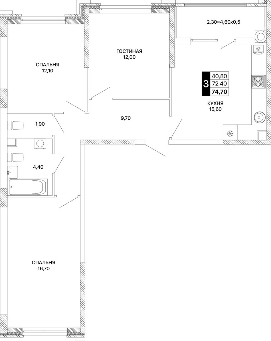 3-комнатная — 74,7 м² 2/12 эт. в Сияние