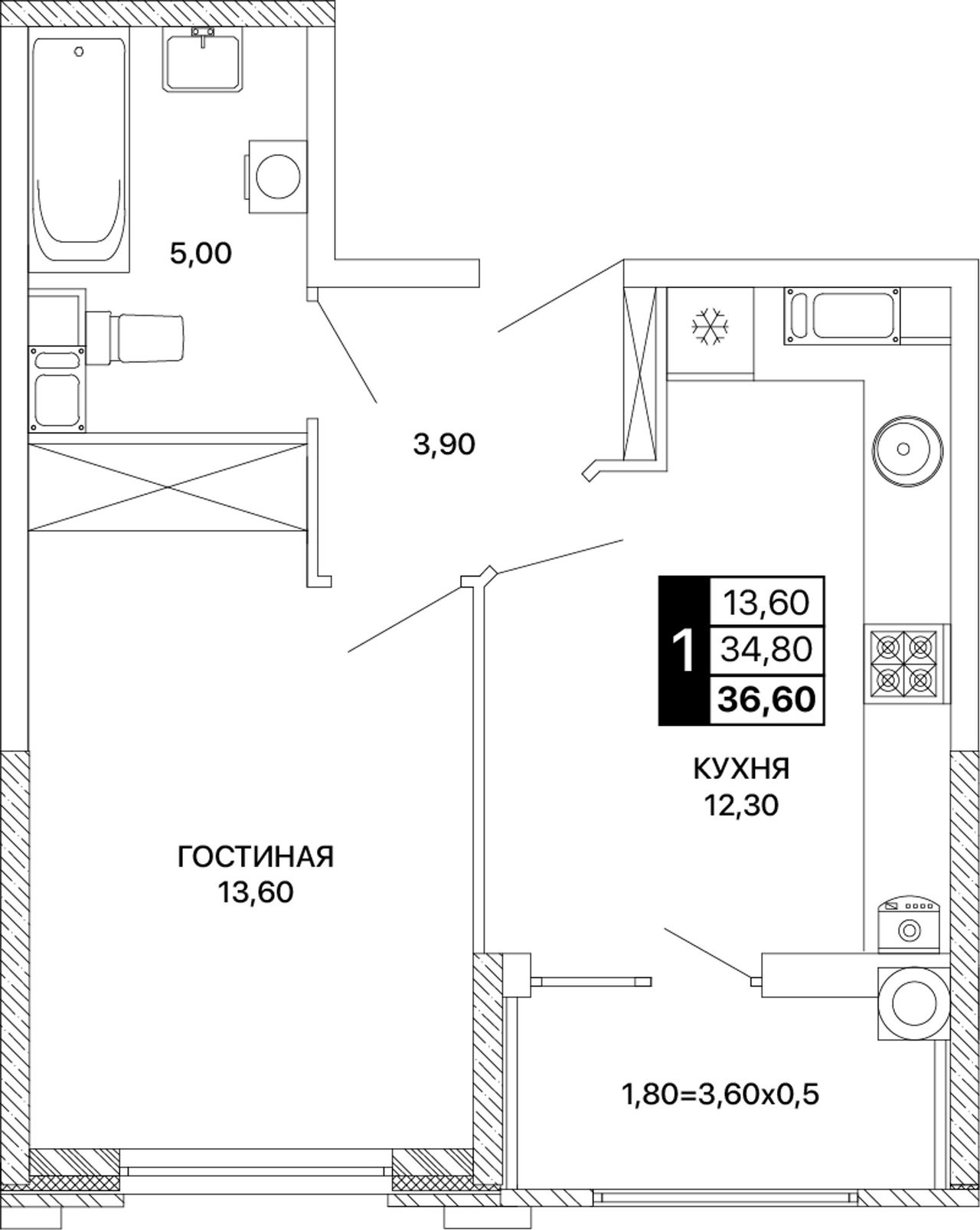 1-комнатная — 36,6 м² 8/12 эт. в Сияние