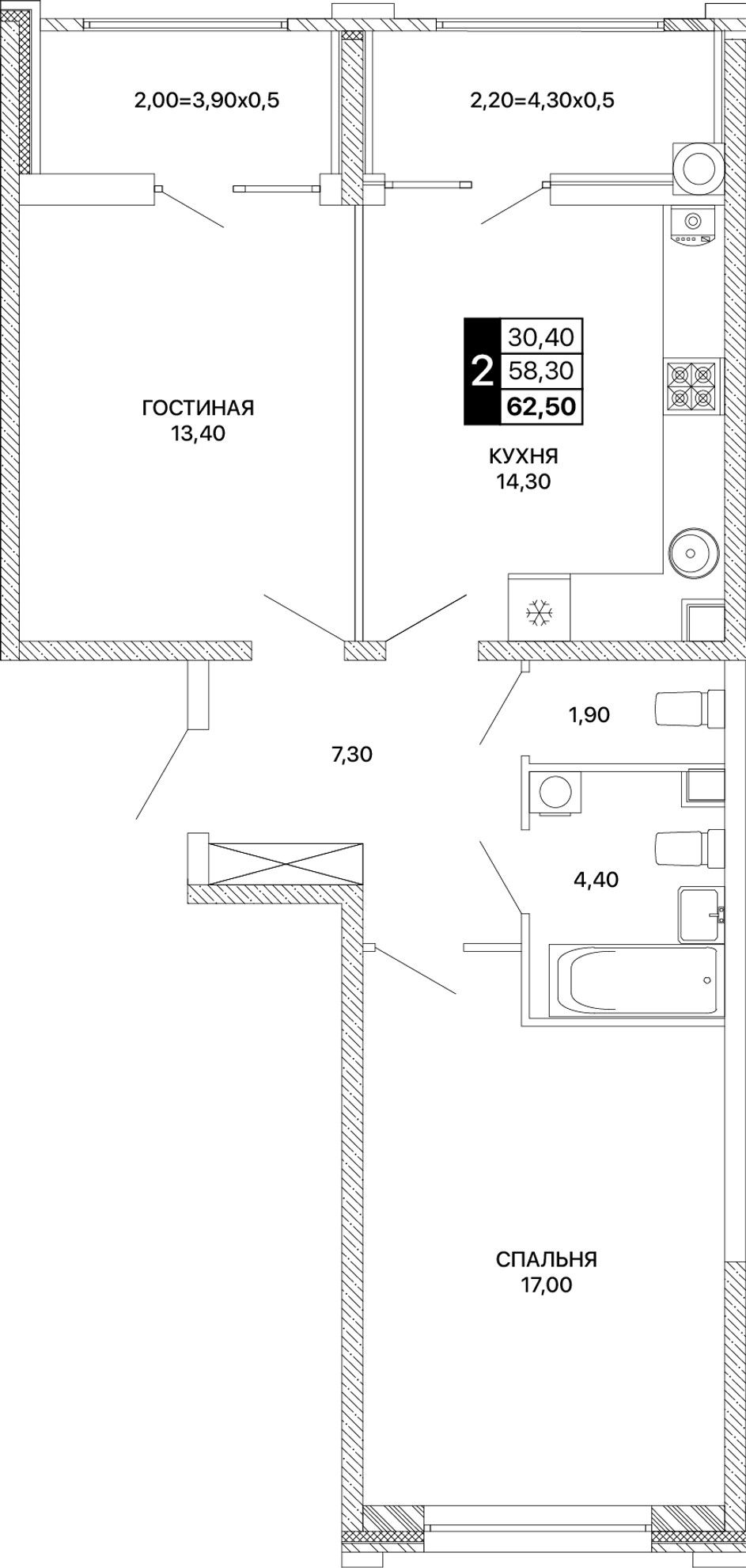 2-комнатная — 62,5 м² 2/20 эт. в Сияние