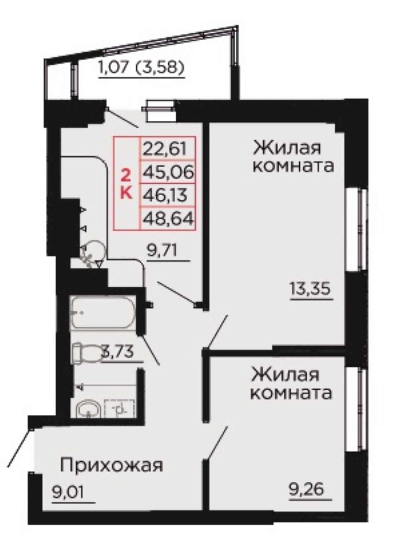 2-комнатная — 46,6 м² 1/9 эт. в Вишнёвый сад