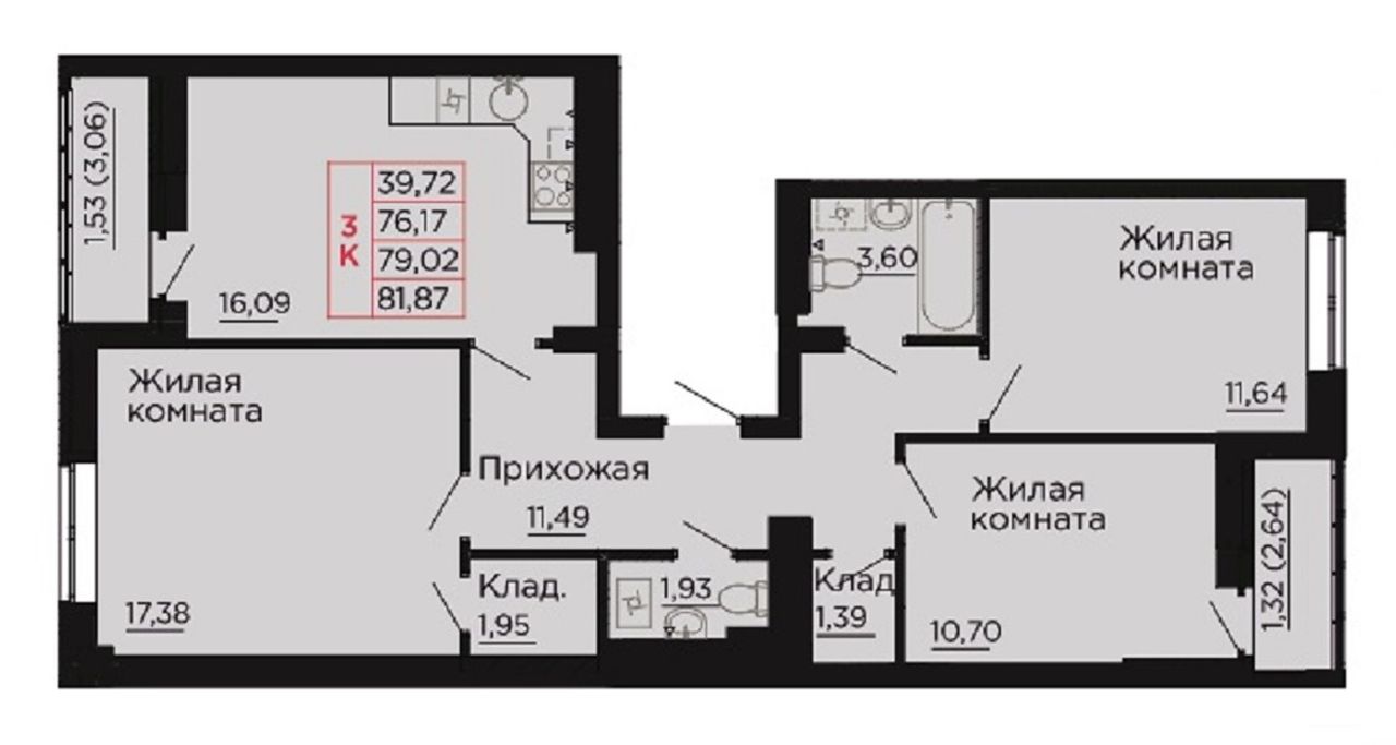 3-комнатная — 79,8 м² 2/9 эт. в Вишнёвый сад