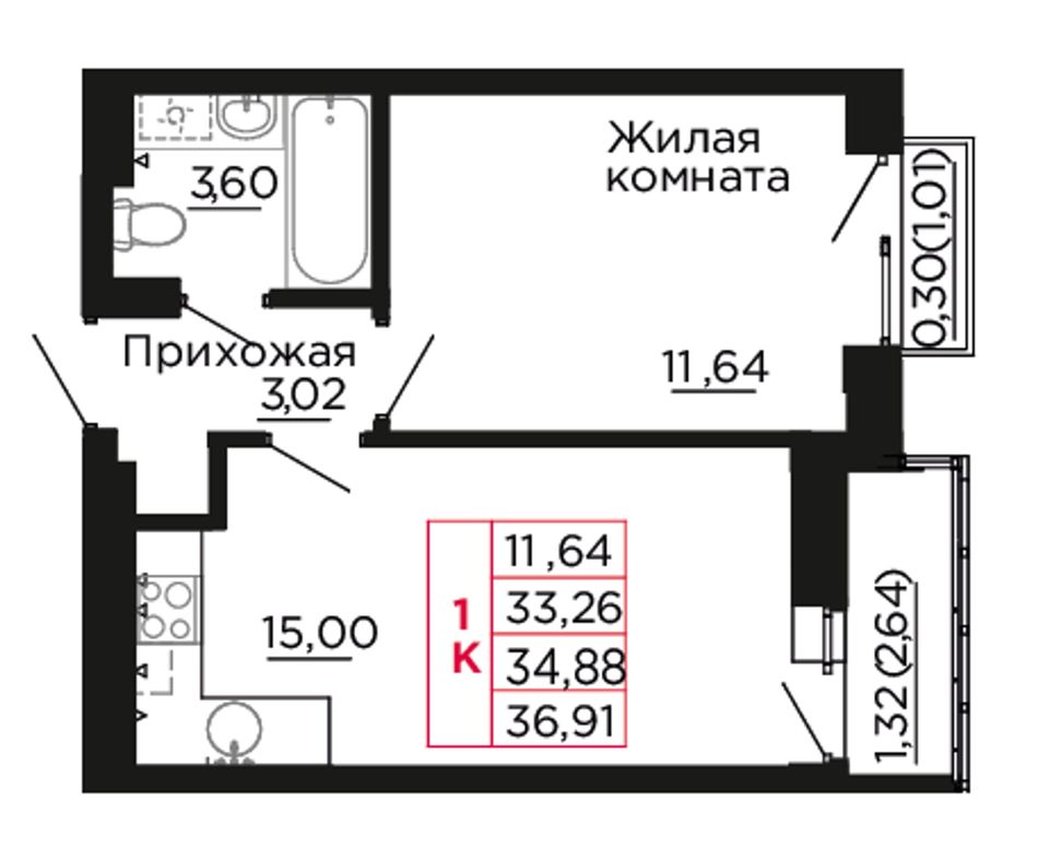 1-комнатная — 35,3 м² 6/9 эт. в Вишнёвый сад