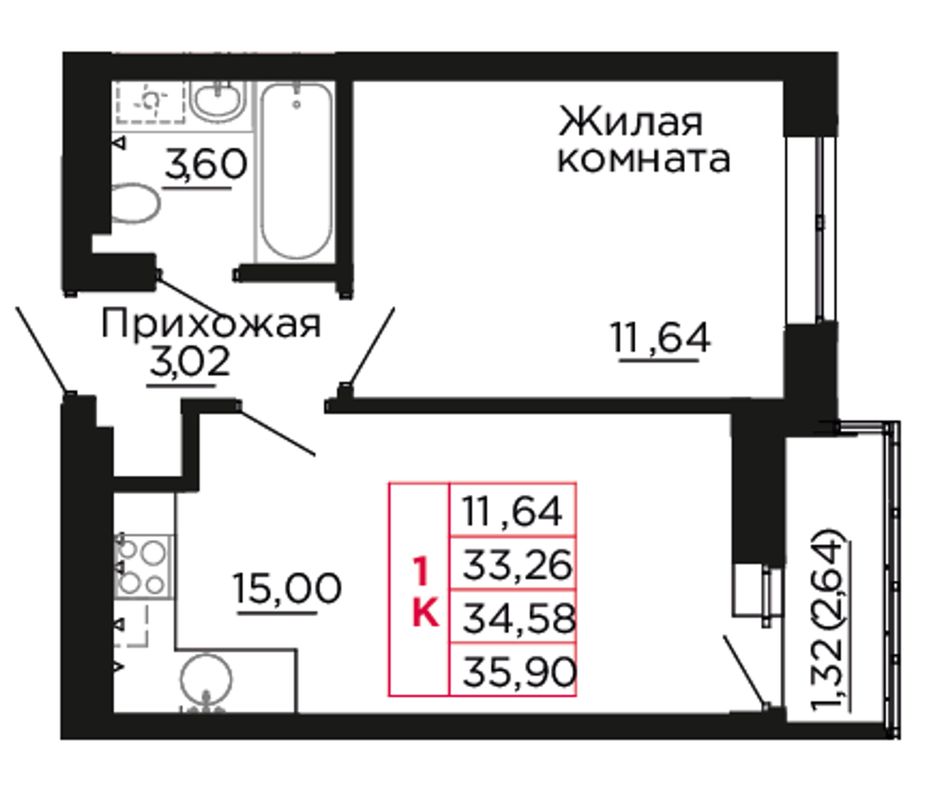 1-комнатная — 34,9 м² 7/9 эт. в Вишнёвый сад