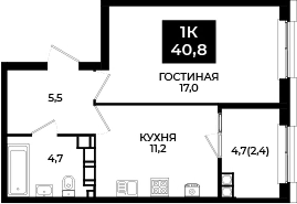 1-комнатная — 40,8 м² 21/24 эт. в Новый Ставрополь