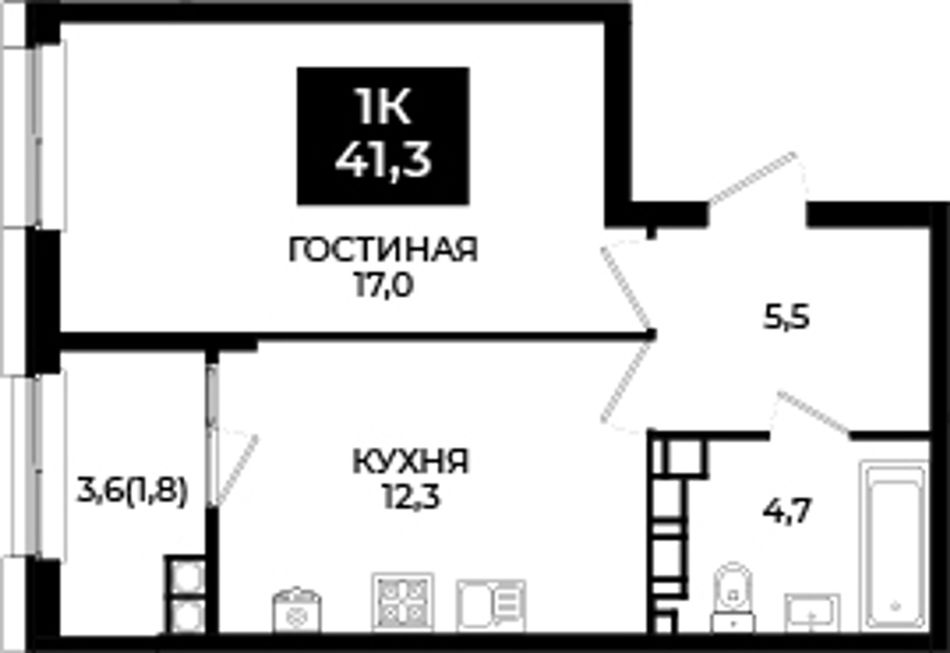 1-комнатная — 41,3 м² 24/24 эт. в Новый Ставрополь
