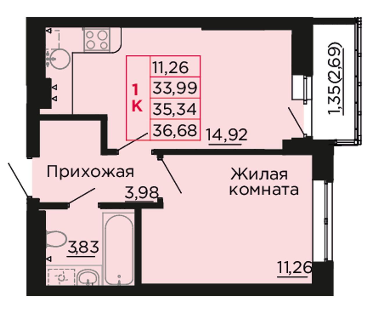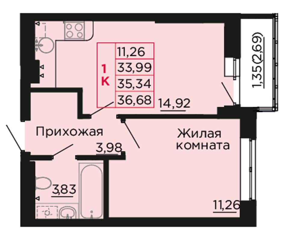 1-комнатная — 35,6 м² 8/9 эт. в Вишнёвый сад