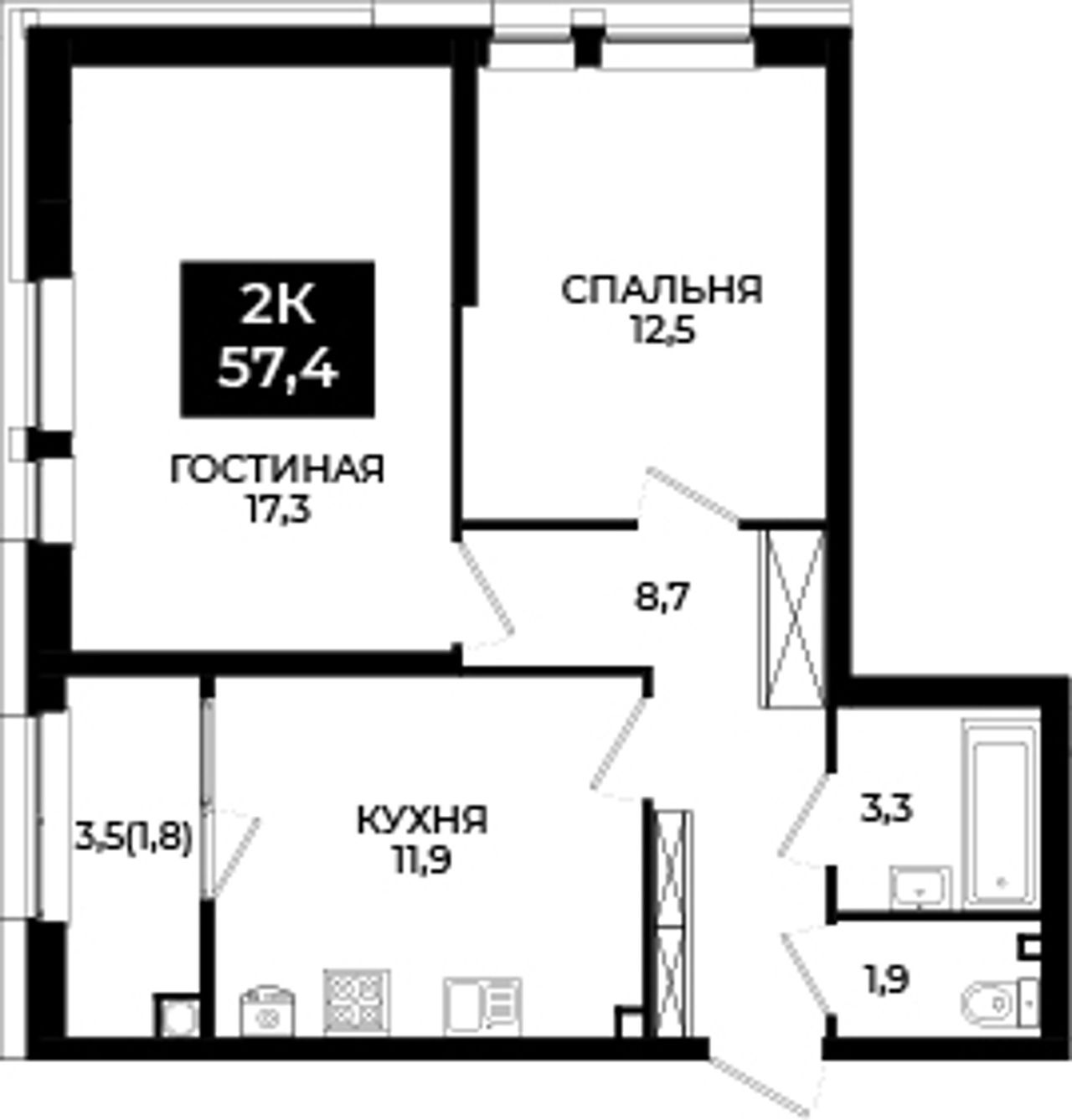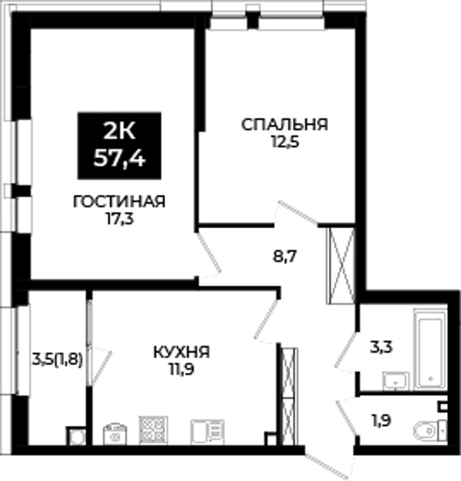 2-комнатная — 57,4 м² 2/24 эт. в Новый Ставрополь