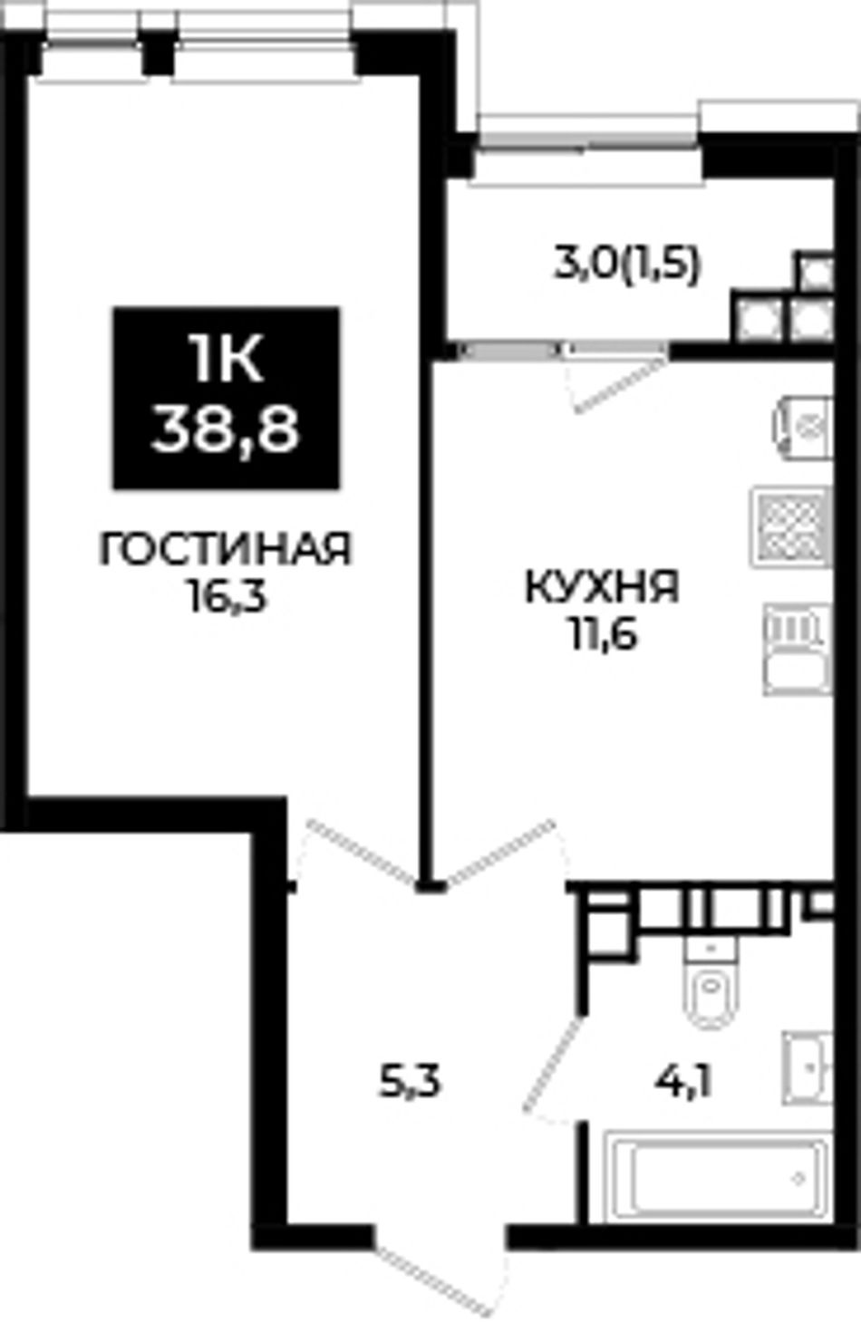 1-комнатная — 38,8 м² 13/24 эт. в Новый Ставрополь