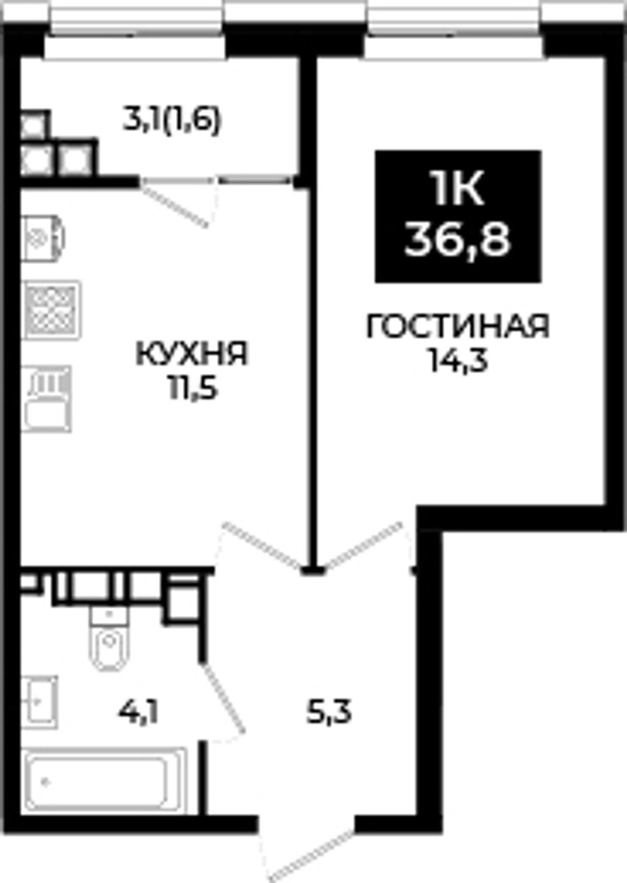 1-комнатная — 36,8 м² 12/24 эт. в Новый Ставрополь