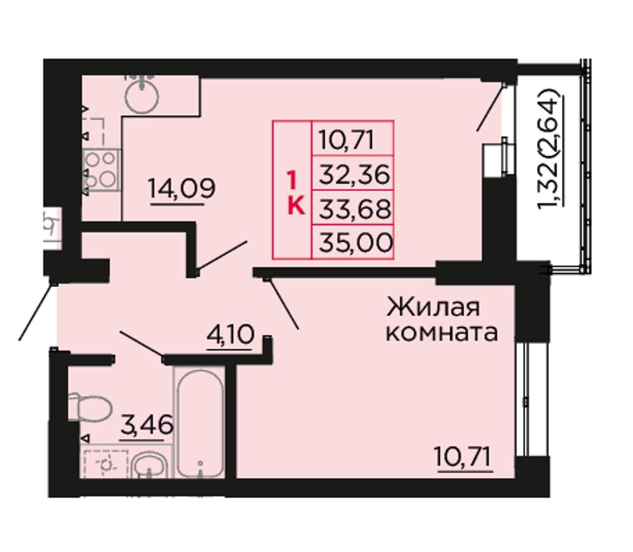 1-комнатная — 33,9 м² 5/9 эт. в Вишнёвый сад