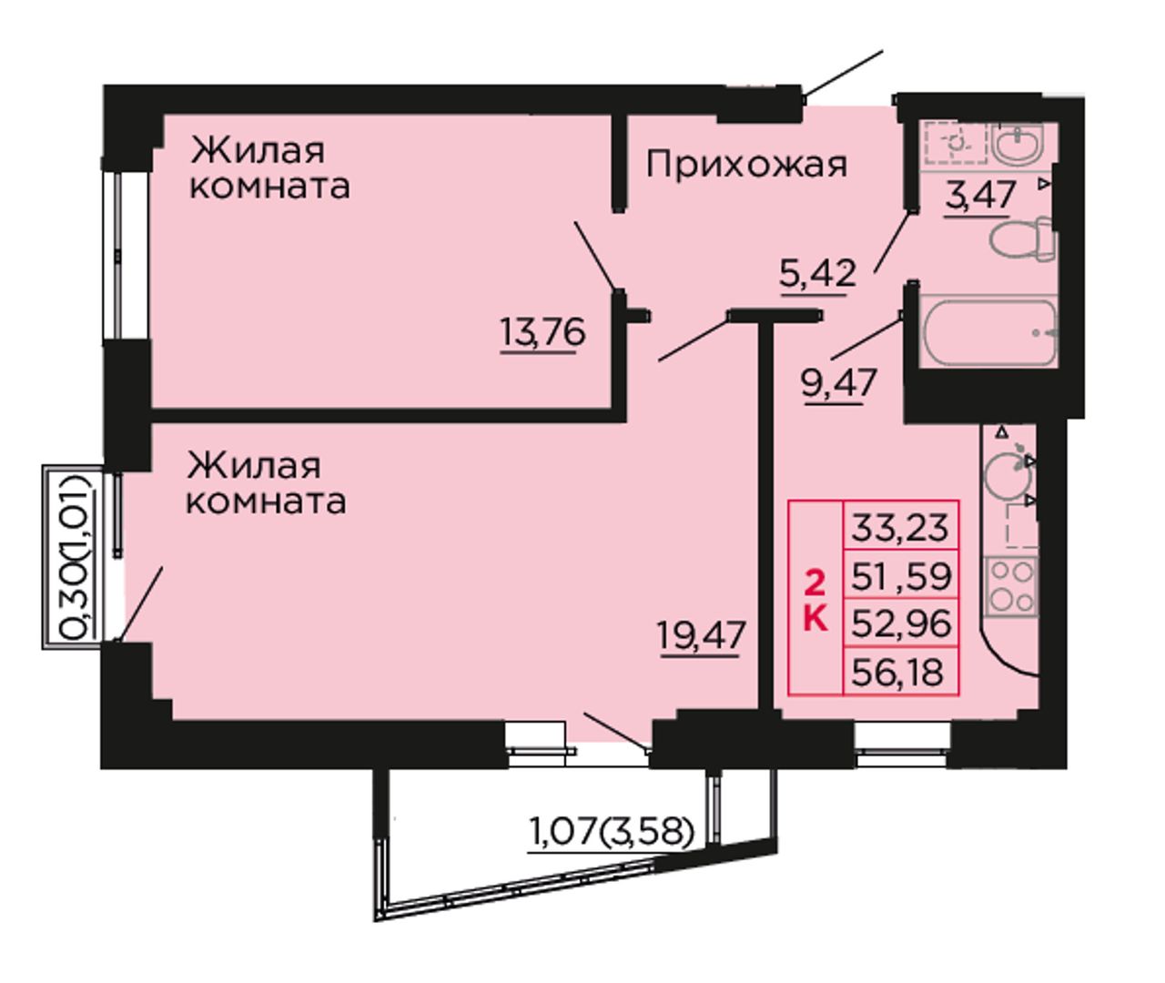 2-комнатная — 53,7 м² 5/9 эт. в Вишнёвый сад