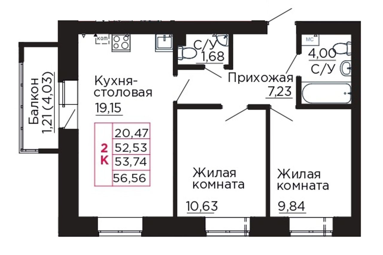 Общая площадь53,74 м²