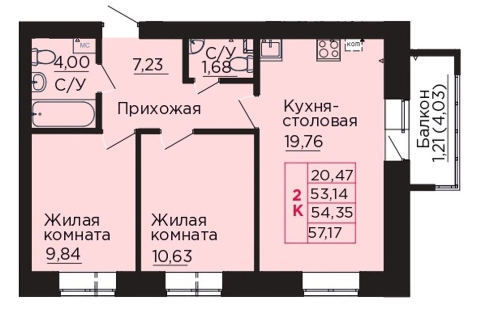 Общая площадь54,35 м²