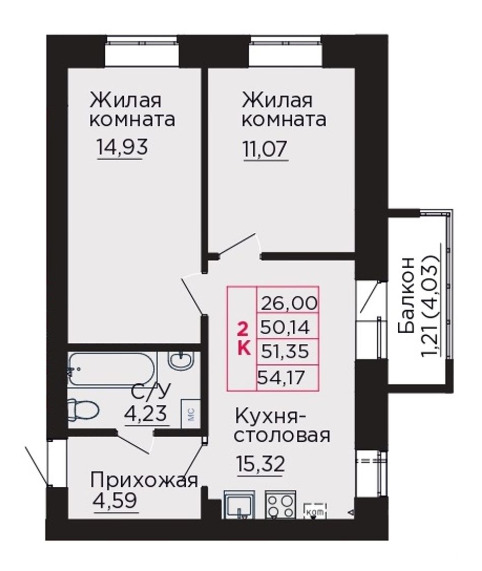2-комнатная — 51,35 м² 3/4 эт. в Вишнёвый сад
