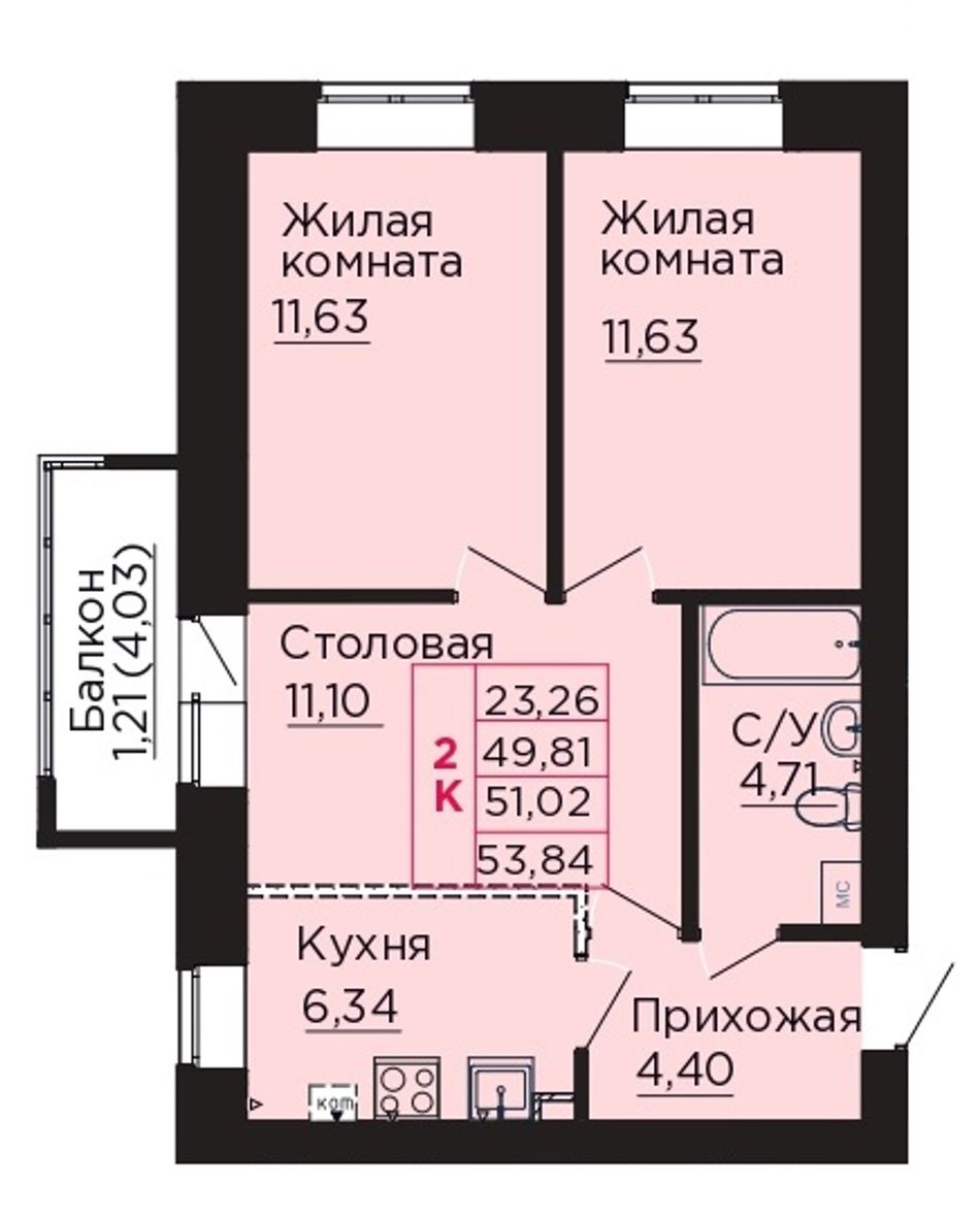 2-комнатная — 51,02 м² 4/4 эт. в Вишнёвый сад