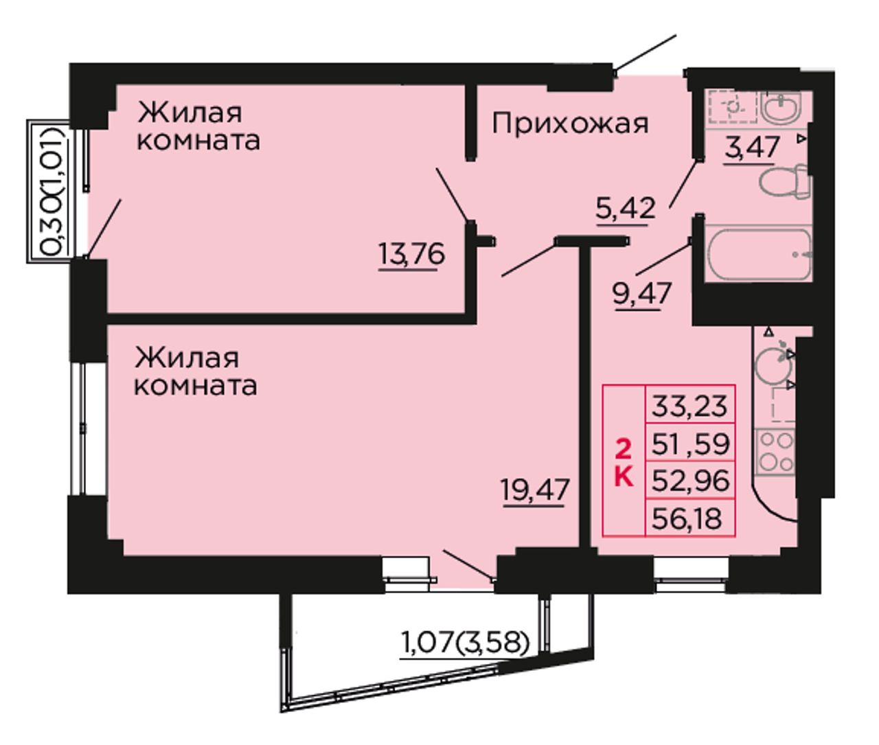 2-комнатная — 53,2 м² 4/9 эт. в Вишнёвый сад