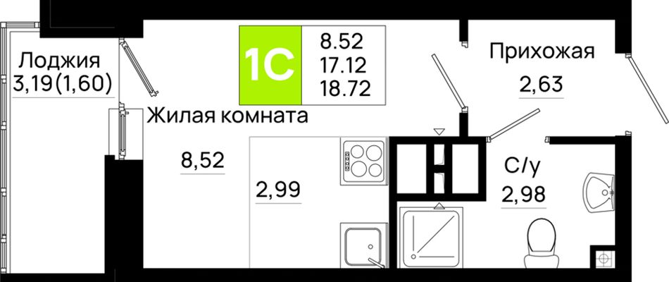Студия — 18,72 м² 17/20 эт. в Октябрь Парк