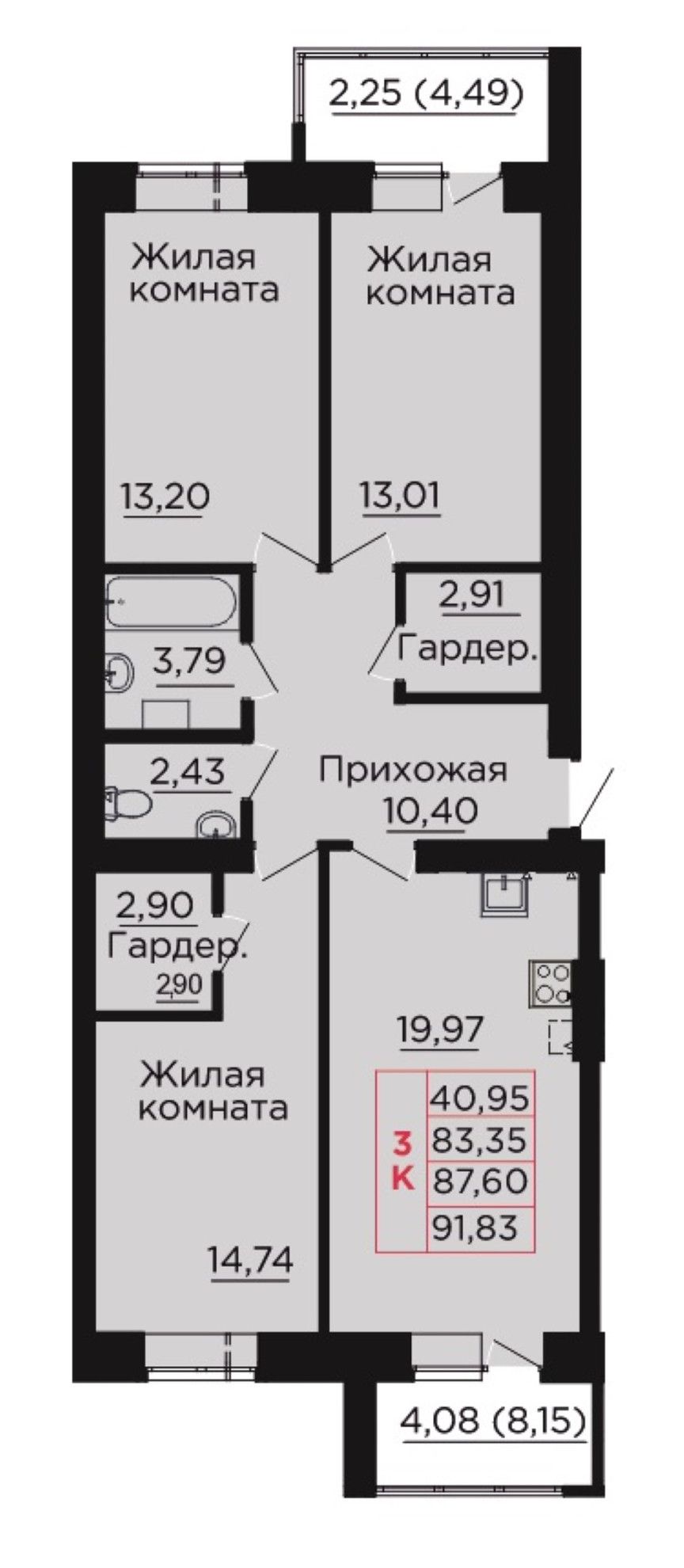 3-комнатная — 88,5 м² 1/4 эт. в Вишнёвый сад