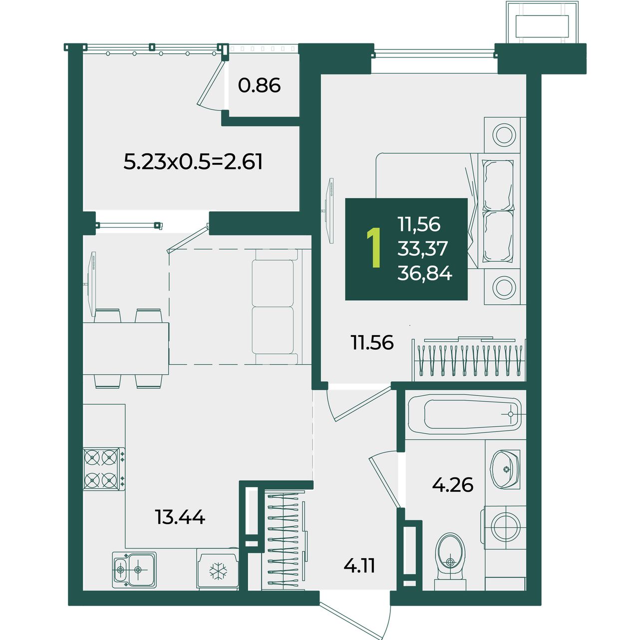 3. 1-комнатная, 36,84 м²