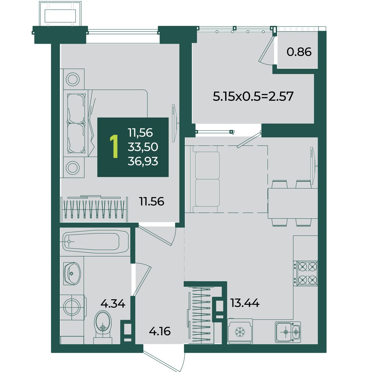 Общая площадь36,93 м²