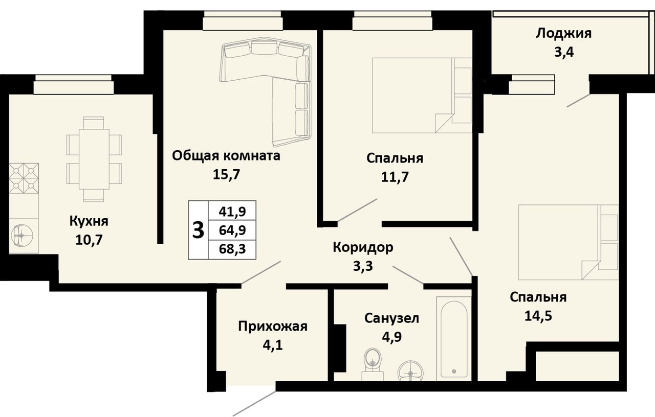 3-комнатная — 68,3 м² 2/4 эт. в Южные соседи