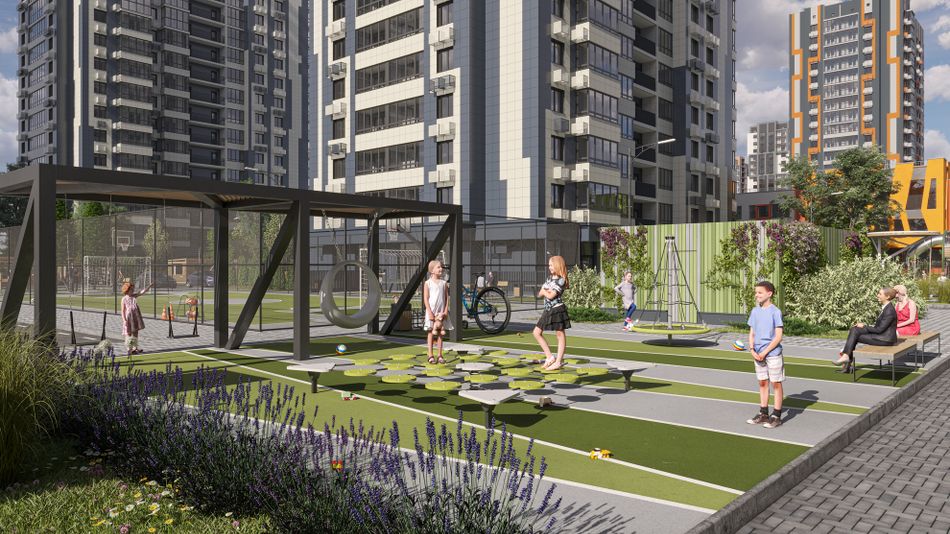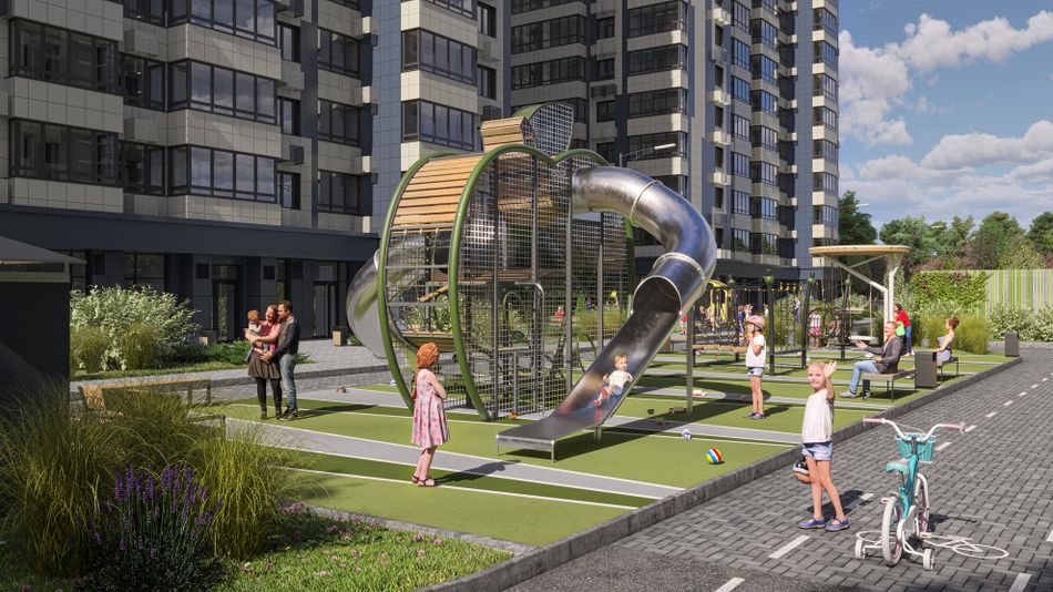 Три 25-ти этажных дома с благоустроенной территорией и многоуровневым паркингом для автомобилей.